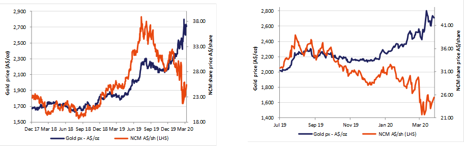 NST performed significantly better in 2019 following the $A gold price nicely, its also enjoyed tailwinds after Super pit acquisition, we did see some divergence during the March aggressive market decline but things appear to be largely back to business as usual.