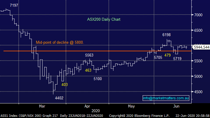 The market undoubtedly is showing some impressive backbone to rally in the face of bad news on both the macro and stock level, plus for good measure we had Challenger (CGF) tapping the market for a $300m capital raise. MM is never keen to sell markets that exhibit strength into bad news but we remain cognisant that it can only absorb so much negativity hence we are considering reducing our market exposure if we see a pop above 6200 - perhaps the straw that breaks the proverbial camels back is looming in the months ahead and a 10% pullback can unfold. However short-term with Scott Morrison urging Australia to push ahead with openings despite outbreaks things still look ok for local risk assets.