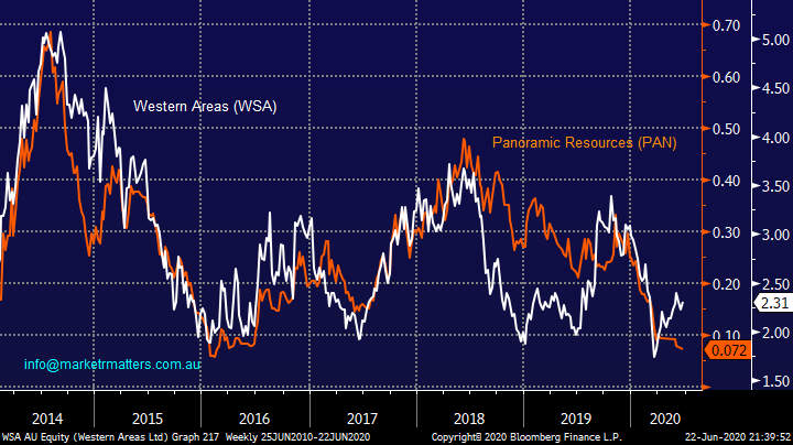 Panoramic Resources now has a market cap of under $150m and considering its decoupling from Western Areas (WSA) this year it’s interesting to see the $630m nickel producers interest – WSA recently took a 19.9% stake through a capital raise by PAN. We feel PAN is a good “cheeky punt” around current levels for the adventurous.