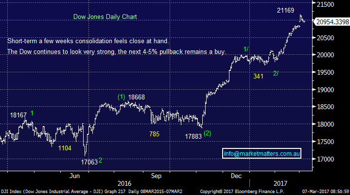 We currently remain bullish US stocks through 2017 and potentially into 2018, although at least one decent pullback is expected ~5% in that time. That does not mean we are stepping away for our call for a larger correction (~25%), it simply means we need to be open minded in terms of timing. Hence being long stocks in general does not concern us however the correlation between the Dow and some of our headline "yield play" stocks is clearly inverted i.e. since August 2016 when the Australian "yield play" stocks experienced a large unwind the Dow is +13.7% while Sydney Airports -21%, Transurban -13% and Westfield -17%.
