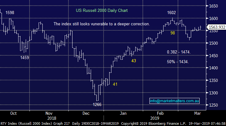 No major change but US stocks, like our own are proving very resilient to any meaningful pullback. We cannot be vaguely negative the US Russell 2000 Index short-term while it holds above 1550, only 1% lower.