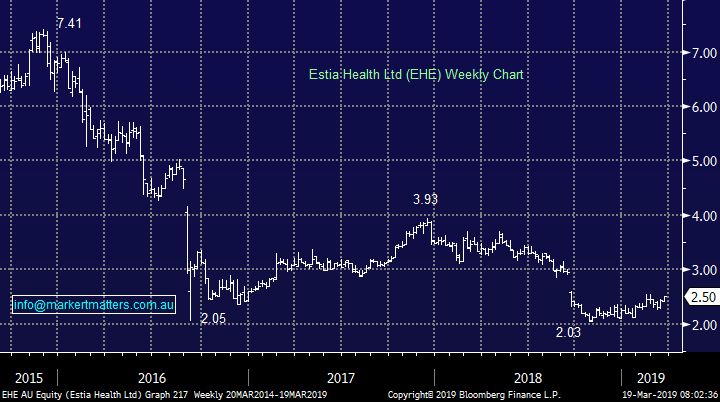 EHE shares rallied last month following an announcement by the Federal Government that they will provide over $650m in additional funding for aged care / seniors – not an unusual move in an election year. The company’s half year results showed an increase of revenue to almost $290m but occupancy was lower than expected plus EBITDA was downgraded a touch - however the stock has shrugged off the result and looks firm.