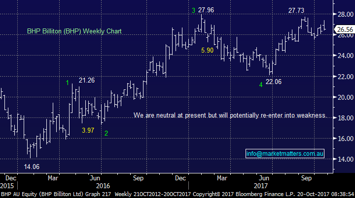 - BHP is due to open under $26.40 this morning, almost 4% below where we recently took profit but still over 5% above our targeted level to re-enter, closer to $25.