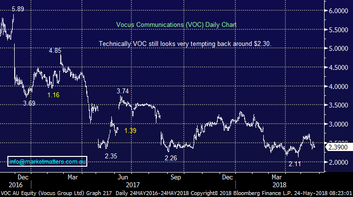 However we note that seasonally the best time to buy the Australian telco sector is mid-June, as it bottoms out before the overall market, hence we would not be in a hurry just yet to press the “buy button”. The other risk for VOC is around capital, and whether or not they’ll tap the market. If the stocks rallies from here, we think that would be a strong possibility.
