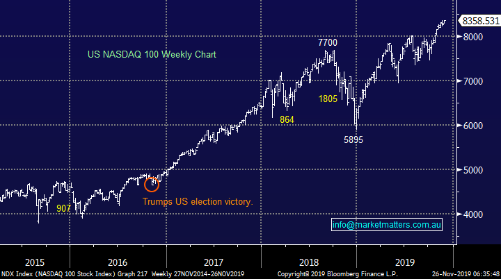No major change, we had given the benefit of the doubt to the post GFC bull market and fresh all-time highs have been achieved as anticipated, a close well under 8000 for the tech-based NASDAQ is required to switch us to a bearish short-term stance.