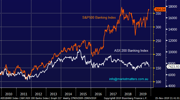 Subscribers who want to see the pain our Banking Sector has experienced compared to the US only have to look at the below chart – the Australian Banking Sector is down ~25% since 2015 while the US has rallied ~50%.