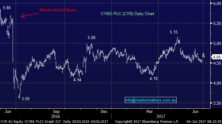 We bought CYB originally in early April at $4.73 then increased our weighting to the stock towards the end of the month at $4.67 booking an average price of $4.71 – we’re marginally down in the position. CYB is the spin out of NABs UK operations and is a ‘self-help story’ rather than one that will benefit from strong top line growth. This is a business with a very high cost base currently, low margins but importantly a low valuation (10.1 times 2018 earnings). It doesn’t yet pay a dividend but will start paying a small one soon and it’s exposed to the UK economy which is clearly going through a tumultuous time as they navigate their exit from the EU. Clearly there are pros and cons to holding CYB, however it seems to us this is more than compensated by its low valuation. We like the exposure to the UK despite the ‘headline risk’, we think management has a credible plan to strip our costs which will dramatically improve margins, earnings benefit from higher interest rates and some regulatory changes should mean they have excess capital on their balance sheet. It looks fine technically as long as it holds above $4.50.