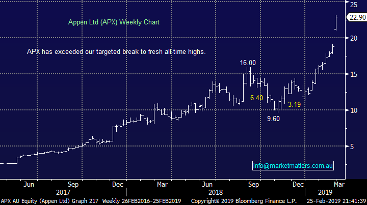 We covered APT in our “Catching our eye” segment yesterday afternoon following the “buy now pay later” companies 19% lunge higher courtesy of a positive outcome from the senate committee on Friday. The outcome was clearly short term positive for the sector, the main risk was that the BNPL space would be rolled into the National Credit Code requiring more stringent credit checking before any credit could be provided – a huge win in today’s tightening regulatory environment although the issue may raise its head again in the future when the debt levels of our millennials become a huge issue.