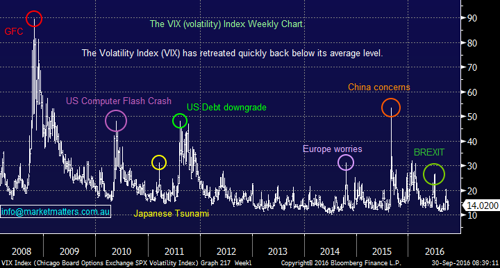 Last night, stocks tumbled 1% in the US on further concerns around Deutsche Bank after rallying strongly in the previous session on the OPEC decision to reduce production. Stock markets are commonly driven by one main theme for a period of time before moving onto the next topic to focus on and often worry about. The VIX (volatility Index) is an excellent way to identify these increased periods of uncertainty for stocks, we have experienced 3 events that pushed the VIX over 20% in 2016 - China/oil concerns in January, BREXIT and the recent 400-point plunge by the Dow on concerns around US interest rates. On the horizon, we have elections in the US and Italy.