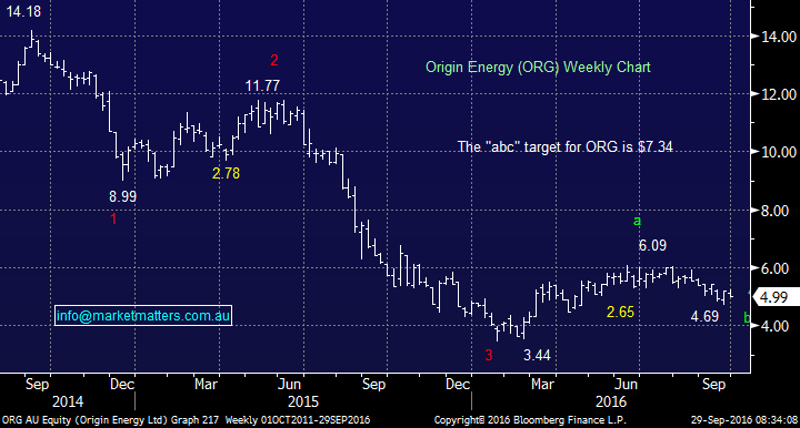 We currently hold 10% of our portfolio via the leveraged play, Origin Energy (ORG). Our initial target is $6.25, with a strong possibility of a rally over $7 - assuming oil unfolds as we are forecasting.