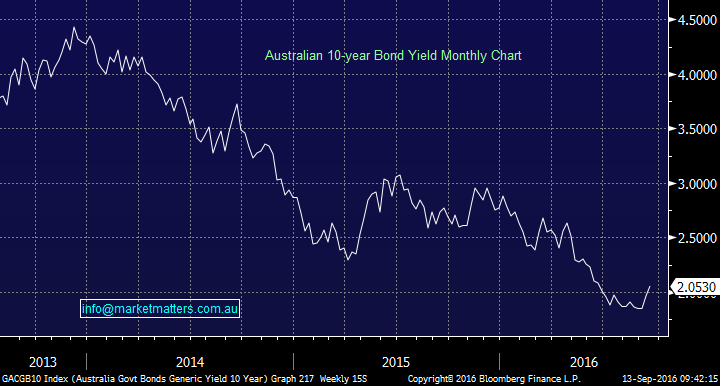 The local Australian 10-year bonds have seen yields rally over 0.2% very quickly and we remain with our view that the "yield trade" has topped out and quasi-bond like stocks are a sell.