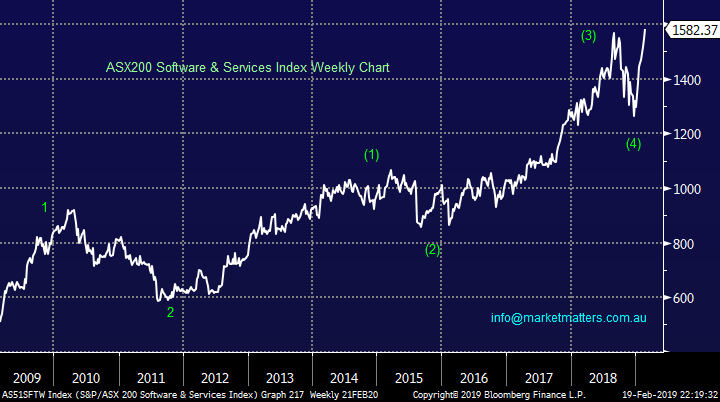 This company is simply shooting the lights out with the board confident of reaching $200m revenue in 2020 helped by Chinese growth which saw revenue up just shy of 50% (the market currently expects $212m by 2020). However, remember our discussion in the Weekend Report around the Software & Services Index, we were anticipating fresh all-time highs but the break looked to have a high risk of failure (see 2nd chart) hence we are not chasing these stocks into their current strength.