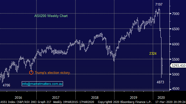 Yesterday we expected a bounce from the ASX200 when / if it tested the 4800 area but it felt like too many people had read our report before the opening as the SPI futures and then stocks opened a lot stronger than anticipated. However we mustn’t get too carried away with bounces as we can see below its hardly a dent in the recent virus provoked plunge by equities.