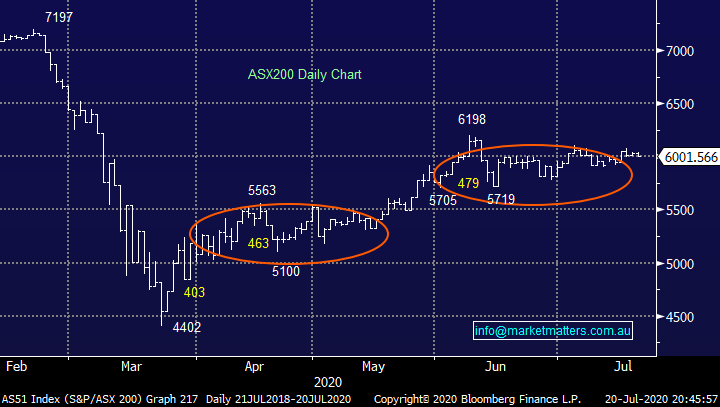 The ASX200 is slowly but surely lulling us all into a false sense of security, the index has now been oscillating around the 6000 area for over month, while history does tell us money is generally lost fighting a trend, sideways in this case, a break in one direction is clearly overdue. Yesterday’s -0.5% decline was fairly muted with over 30% of the market closing up on the day but when the “Big 4” banks fall by ~1% and the Energy Sectors tumbles by -2.6% it’s an uphill battle for the underlying index. The market had a knee jerk move lower at 11am when we saw Victoria & NSW in particular declare their latest COVID-19 statistics plus accompanying rhetoric, there’s no doubt what’s driving sentiment in stocks short-term.