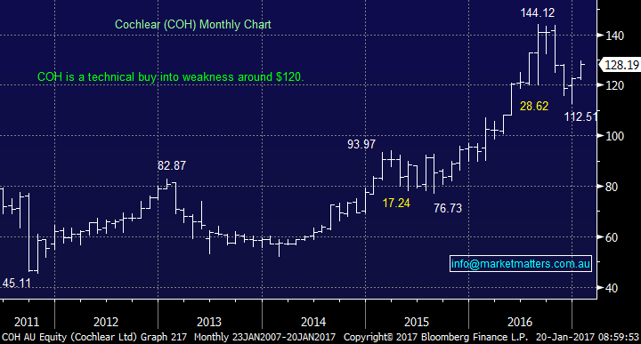 Another quality company in the healthcare sector we like for similar reasons is Cochlear (COH). While it’s certainly not cheap (PE of 30.7 times) which is pretty typical for this stock, they report earnings on the 14th February and strong growth is expected (~20% EPS growth).