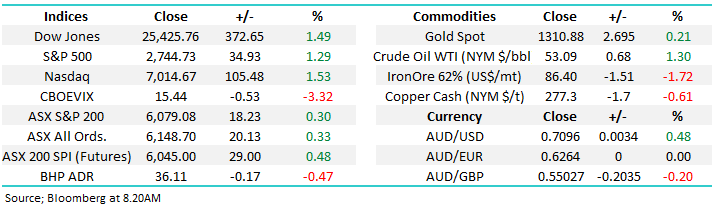 Overnight US markets were strong greeting the news mentioned above with most indices gaining ~1.5% - BHP closed down 117c while the SPI is pointing to a 0.5% gain locally but remember CBA trading ex-dividend will take some points from the index this morning.