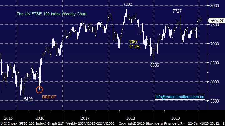 The UK now has what appears to be a robust government in place led by the charismatic Boris Johnson (BOJO) which in our opinion is an exciting platform for growth in the UK in the years ahead i.e. the combination of a govt. who looks set to spend money combined with a central bank (BOE) which is likely to cut rates = great for the UK economy & therefore stocks after a long period of underperformance.