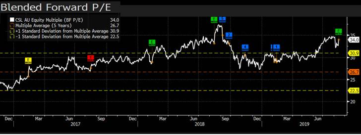 CSL is an undoubtedly a great company, but what price are the shares worth remains the question? Yesterdays solid set of numbers reiterated both of these points as we saw the stock make fresh all-time highs taking the companies Est. P/E for 2002 up to 34x in the process. Over the past 5 years CSL has traded on an average P/E of 26.7x however given the low interest rate environment and consistency of CSL’s growth, then a P/E of 34x is high, but not excessively so.
