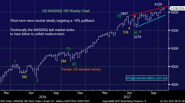 The ASX200 has broken out with a bang over the last 2-weeks rallying almost 5% in very quick time. US stocks continue to trade around their all-time highs and everything looks healthy with the stock market for now! We remain bullish local stocks targeting a clear break of the psychological 6000 area in 2017 / 8 although that is now pretty close. However from a risk / reward basis we would not be chasing stocks at current levels in general terms as we continue to believe a ~5% pullback is close at hand for US stocks which is highly likely to slow down the recent advances locally.