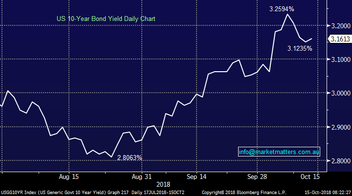 As some background, the world looks towards the US 10 year bond yield as a measure for the cost of money, or the ‘risk free rate’. Last week, US bonds were bought into the volatility which pushed down yields.