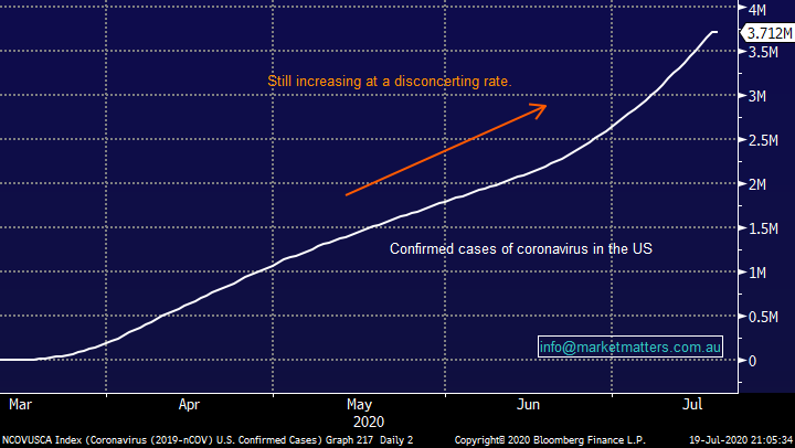 Governments resolve across the world is certainly being challenged as they battle to keep their economies firing while at the same time balancing the fight against COVID-19. On one extreme we have the US who have gone back to work even as we can see below, they’ve not remotely “flattened the curve” whereas Victoria has gone back into lockdown costing the state plenty economically. With an effective widely available vaccine still likely to be over 12-months away the balancing act looks set to continue although the rhetoric from many politicians is sounding more pro their economies by the day with “herd immunity” not mentioned but definitely being considered by many – the US has already experienced well over 1% of its population contracting the virus.