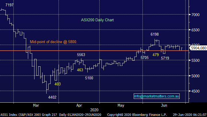 The ASX200 futures were slapped fairly hard after-market on Friday implying the index will open down almost 2% this morning, with the $A testing 68.50c on the downside at 6am this morning another “ risk off” day feels likely. The world has now endured more than 10 million confirmed cases of COVID-19 and over 500,000 deaths and with many parts of the globe experiencing rising numbers we might just be in the early stages of a long and uncertain battle with the virus as many experts still believe a vaccine is 12-18 months away at best. However the stock markets largest fear is often uncertainty and if the COVID-19 journey while tough and unpredictable doesn’t throw up too many nasty surprises it might just ”get used to it” in its own optimistic way, an outcome we’ve seen before and will see again.