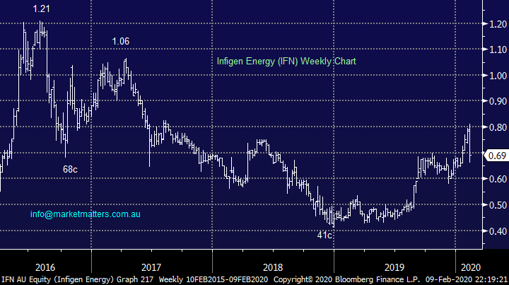 1 – Renewable energy business IFN continues to struggle and we see no reason to chase this stock, another 10% decline back towards 60c feels likely.