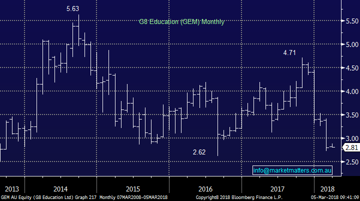 Hi John, thanks for the positive comments - much appreciated. Firstly, be careful focusing on yield in underperforming stocks the market is voting that it’s not sustainable – think Myer and Telstra. I wrote the following the day of their recent result and that still holds true; GEM was whacked today and this is a stock we discussed as a potential income play a few months ago but on further analysis, gave it a wide birth. They missed on most metrics and the very poor recent run for the early childhood company continued. The main issue today was not the miss in terms of profit (underlying of $93m v $100m exp) but occupancy which is still weak suggesting no real turnaround / improvement in the offing. There will be a time to buy this one, but just not yet.