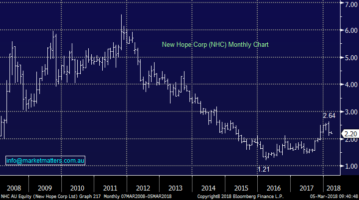 · I could buy NHC around / under $2.20 targeting at least $2.70 with stops under $1.90 – ok for investors keen on the sector. You may have noticed a few smart guys in the coal space exiting recently. Tony Haggarty of Whitehaven (WHC), who was the ex-CEO and large holder has just sold 90% of his stock.