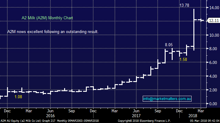 Hi Tushar, A2M has enjoyed an amazing rally over the last year as it kicks goal after goal but it’s now trading on a valuation of 45x estimated 2018 earnings i.e. it’s not cheap. Remember we are concerned for high P/E stocks as interest rates rise.