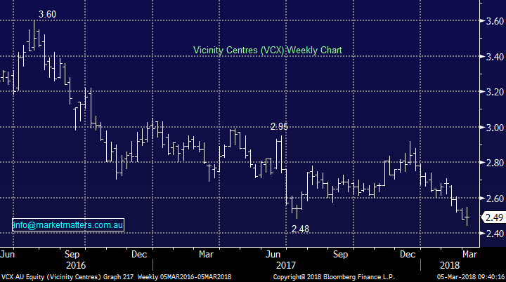 2. Vicinity Centres (VCX) – We can see a few weeks between $2.40 and $2.60 but the downtrend still feels fully intact. We wrote the following in this week’s income report that holds true. We are negative property yet we hold Vicinity (VCX) - a retail landlord. This too is a value / yield play however it’s gotten cheaper since we bought - the position showing a ~5% paper loss. VCX reported an inline result mid-month with occupancy at 99.5% with a WALE of 5.2 years – which is the weighted average lease expiry. The retail sector is facing challenges (as shown through margin compression of our retailers) and Vicinity are getting hurt as a consequence. They are trading at a 13% discount to the value of their assets – which is cheap. The macro backdrop goes against this holding and at the moment that is winning out. This stock remains on our SELL radar and we have no interest in the property sector in a general sense.