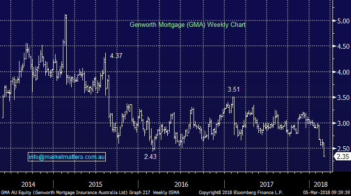 1. Genwoth Mortgage (GMA) - technically a stock making fresh all-time lows has to look poor, and at this stage GMA does. I would become bullish on a close back over $2.61 which is essentially a move back over last week’s high. Of course, the stock went ex-dividend for 12cps fully franked last week which equates to ~17cps gross. We hold GMA because it’s cheap, has excess capital and our original thesis was the market had become too bearish housing + of course the yield was huge. These elements still stack up but it seems the market does not agree with us, and the market is always right! This is a stock on the chopping block, but looking for better levels.