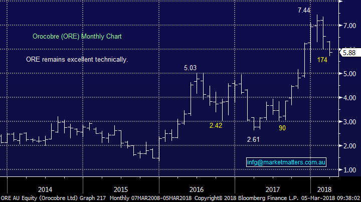 ORE remains our second favourite stock in the sector and we could be buyers around $7.60 however due to prudence we are unlikely to add aggressively to our lithium exposure at this point in time.