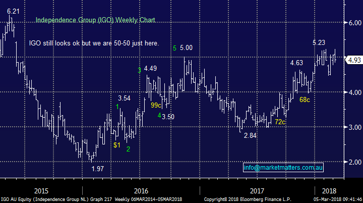 1. Independence Group (IGO) $4.93 – we remain net positive IGO looking for a move towards $5.50 but risk / reward is not attractive here.