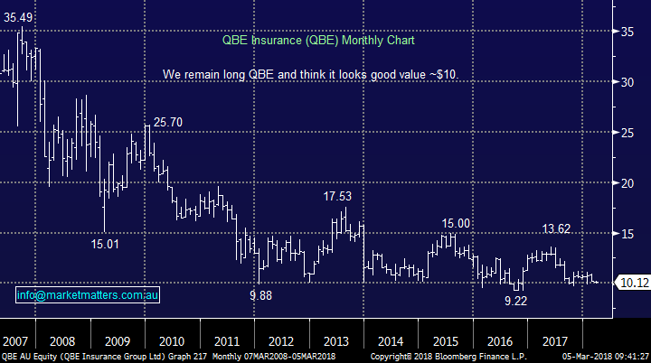 Hi Mark, QBE has given us our fair share of frustration over 2017/8 as it struggles on the corporate level even with tailwind of a weakening $A and rising global bond yields. Our view at MM is the macro picture will remain favourable for QBE and the new captain at the helm will steer the ship in far better direction. The market hates it, which is understandable however simply put, we think there will be a time soon where all the drivers for QBE earnings will finally provide a tailwind.