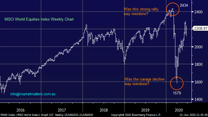 At MM our stance has not changed including the anticipated ongoing waves of volatility through 2020. We remain net bullish for the next 12-18 months given huge levels of stimulus but considering how far the recovery since March has already unfolded we are now sellers of strength and buyers only of decent weakness. The recent resurgence in the virus provides a reality check that it’s going to take longer than many anticipated to “get back to normal” which should keep valuations in check.