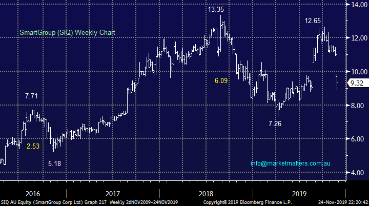 2 – SmartGroup (SIQ) $9.32 – the salary packaging company was smacked last week after announcing an in-line trading update and the stepping down of its long standing CEO. The respected departing CEO has been with the company for 19-years although early indicators are the transition looks to have been well thought out. Investors are clearly focusing on the combination of the fear of the unknown and the potential fresh 2.5% overhang of shares in the business but we question whether this warrants the huge stock revaluation.
