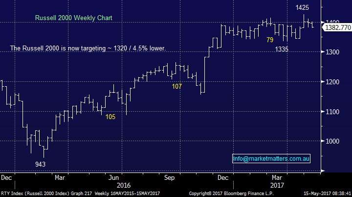 What has been interesting of late is the exceptional calm within stock markets, last week the “Fear Index” (VIX) tested 24-year lows. Pretty amazing stuff when we consider the news flow around just Donald Trump and North Korea to raise two simple topical examples. We believe that US stocks are positioned perfectly for a 4-5% correction, they just need a small catalyst and the May factor in investors’ minds will probably do the rest, making a pullback self-fulfilling!
