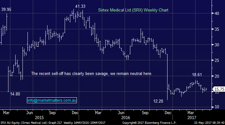 In late April, trial results were released comparing two treatments for late stage liver cancer. The treatments were SIRT, pioneered by Australian biotech, Sirtex, versus Sorafenib. The market was clearly hoping for more from SRX and has limited tolerance with the Australian bio-tech following its 60% decline since the 2016 ~$41 highs, hence further weakness prevailed which is highlighted by the following chart.