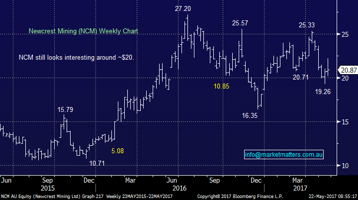 However the position remains clearly underwater but it’s now more of a sector issue than stock specific with RRL ~12% below its April high. We still intend to accumulate further NCM and RRL but short-term the sector feels heavy so we are maintaining patience.