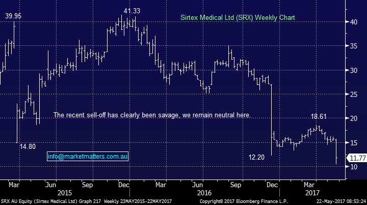 In the case of SRX, last week’s large decline looks all too familiar given something similar played out in December of 2016. Using this as a guide, we saw the stock snap back from the initial destruction before trading sideways for the next 6 months. Although we see now think Sirtex is interesting, with some clear speculative appeal, the stock is only for the brave.