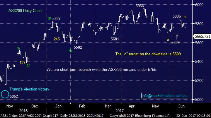 A few days rest would not surprise, but unless the ASX200 can rally back over 5755, we will maintain our negative bias. There are only 7-trading days remaining in the seasonally weak May-June period and it certainly has lived up to its reputation – will July as the second strongest month of the year? So far, we have corrected only 5.5%, still short of the average 6.9% since the GFC which targets 5545.