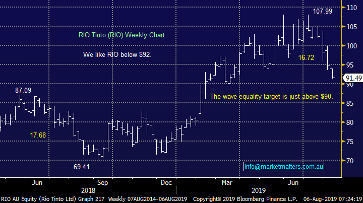 3 – RIO Tinto (RIO) $91.49 & Fortescue Metals (FMG) $7.09: we are looking to average as touched on earlier, both into fresh weekly lows – around $90 and below $7 respectively.