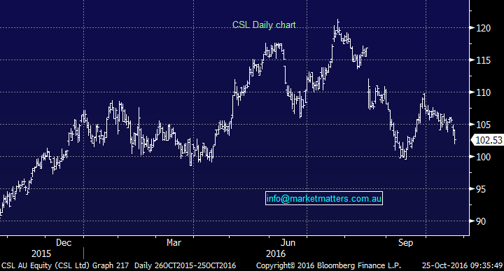3. CSL Ltd (CSL) - We are long CSL and envisage the stock range trading between $100 and $115 for a while. CSL is trading on an est. 2017 P/E of 28x.