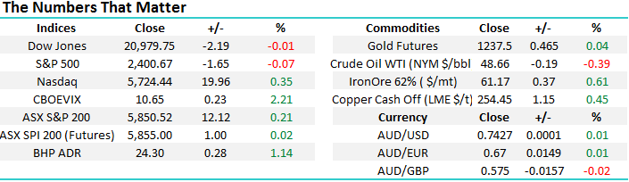 US markets were quiet last night again retreating after making fresh all-time highs with the exception of the Tech. NASDAQ which continues to power higher. From a risk / reward perspective our preferred strategy at present is to remain patient in an attempt to buy the next pullback, when / if it finally unfolds. If our current projection is correct and equity markets are in the mature stage of their 8-year bull market we should see some decent “choppy style” retracements as the market slowly completes its strong advance since March 2009.
