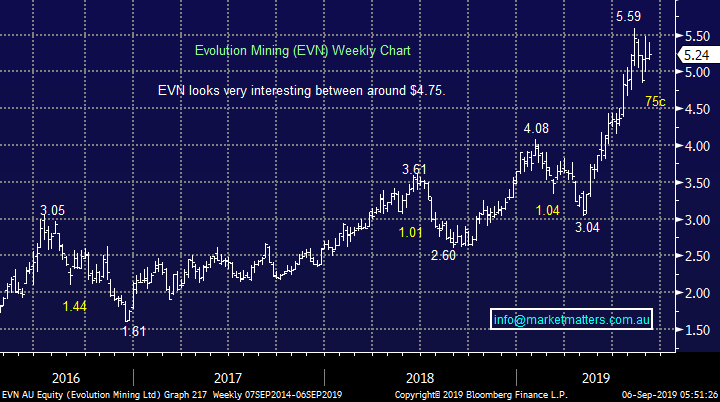 Overnight gold tumbled -$US35/oz / 2.2% on the trade talks news sending the gold miners ETF down around 5%.The local gold sector has already been punished as investors appeared to pre-empt this correction in gold, not helped by the $A finding a floor – our updated ideal entry levels into some well know names are: