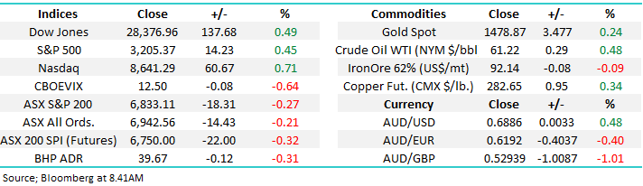 Overnight US stocks made fresh all-time highs with the broad based S&P500 adding +0.45% but the SPI Futures are calling the ASX200 to fall around 20-points early this morning with the reduced optimism of a February rate cut the likely reason.