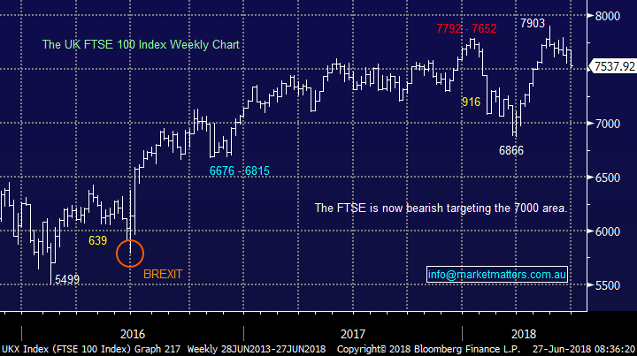 Similarly the FTSE has generated a technical sell signal targeting below the psychological 7000 area. Part of the reason of our “sell mode” at MM.