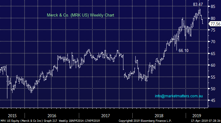 Global health business Merck has slipped 4% over the last 5-days although we should not forget its stellar performance over the last 12-months. Cancer immunotherapy antibody Keytruda is the product which should fuel Merck's growth into the future but the stocks feels like it simply needs a rest.