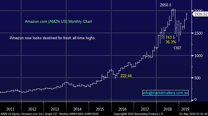 Overnight Amazon slipped -0.6% in sympathy with the sector but we believe the stock remains on track for new all-time highs.